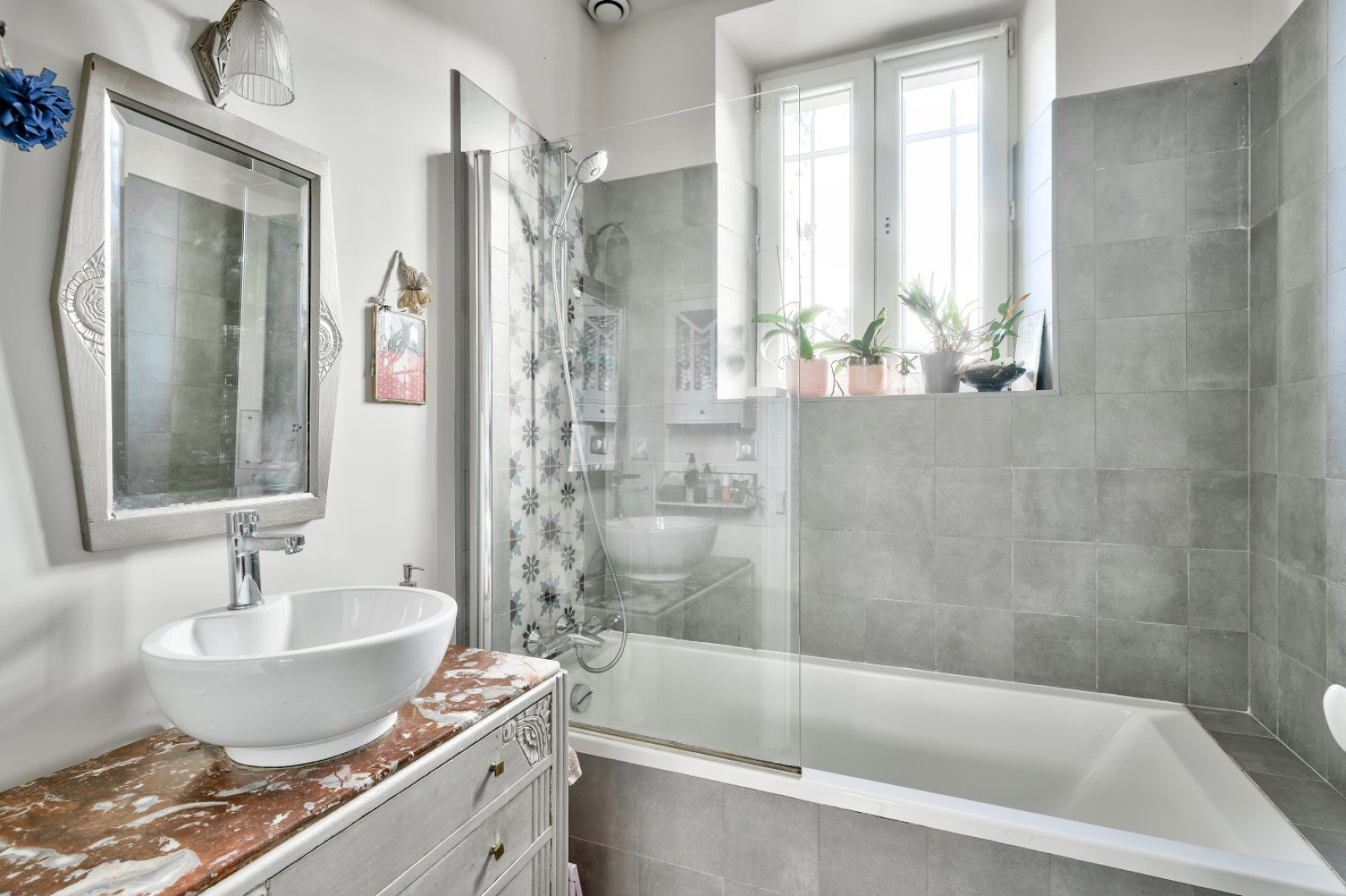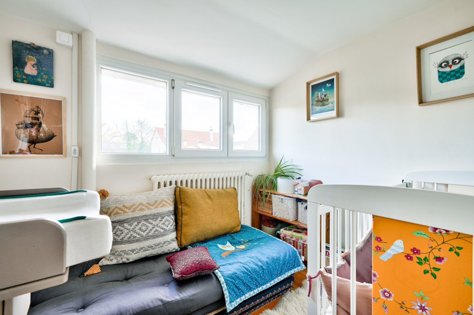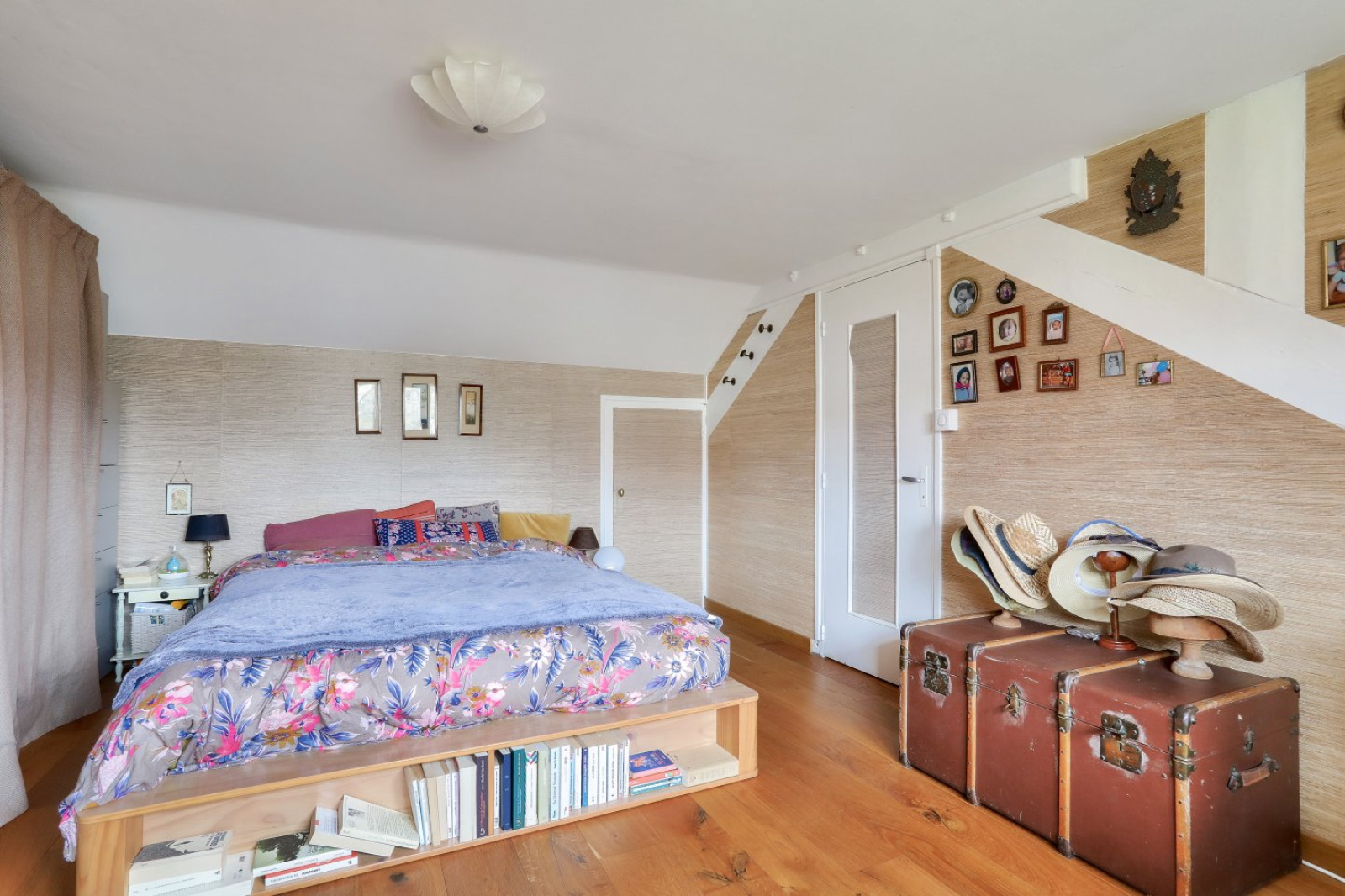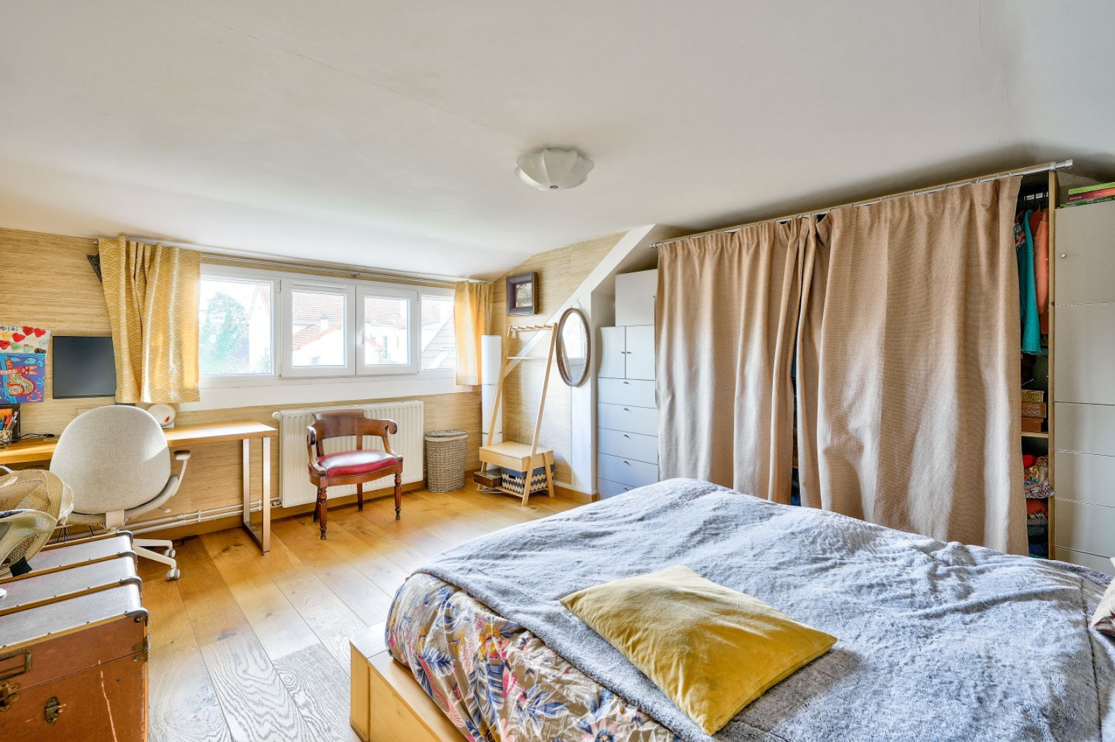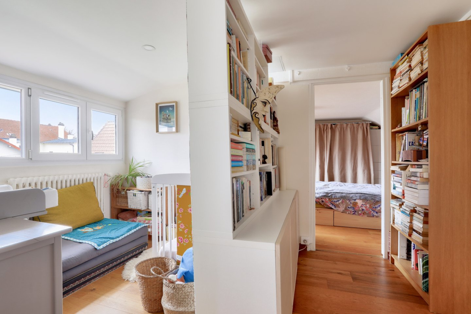 À l'étage, l'espace nuit se compose de deux belles chambres de 12 et 16 mètres carrés, d'un grand palier pouvant être aménagé en bureau ou en chambre de bébé. Une salle d'eau avec douche et vasque et un petit grenier complètent l'étage.