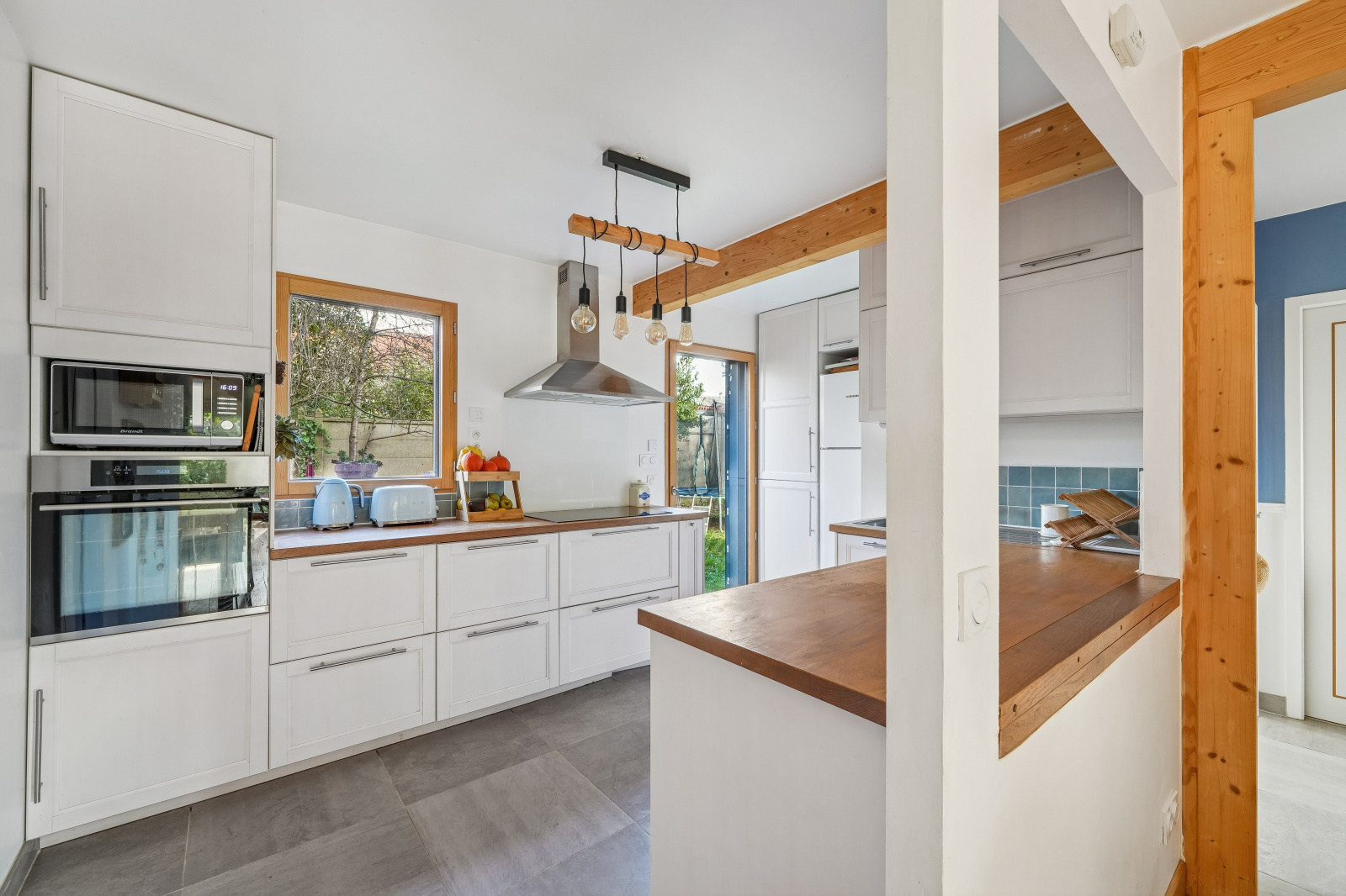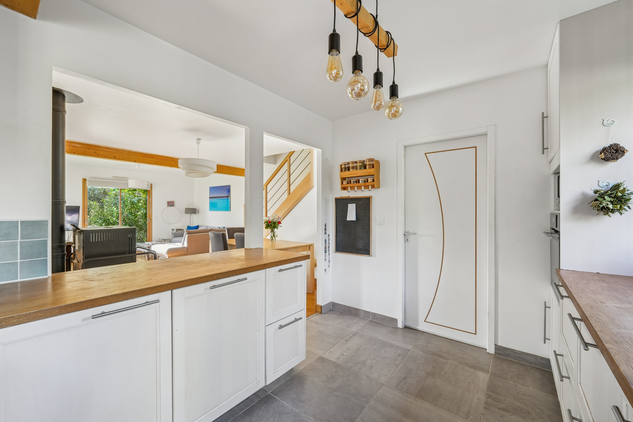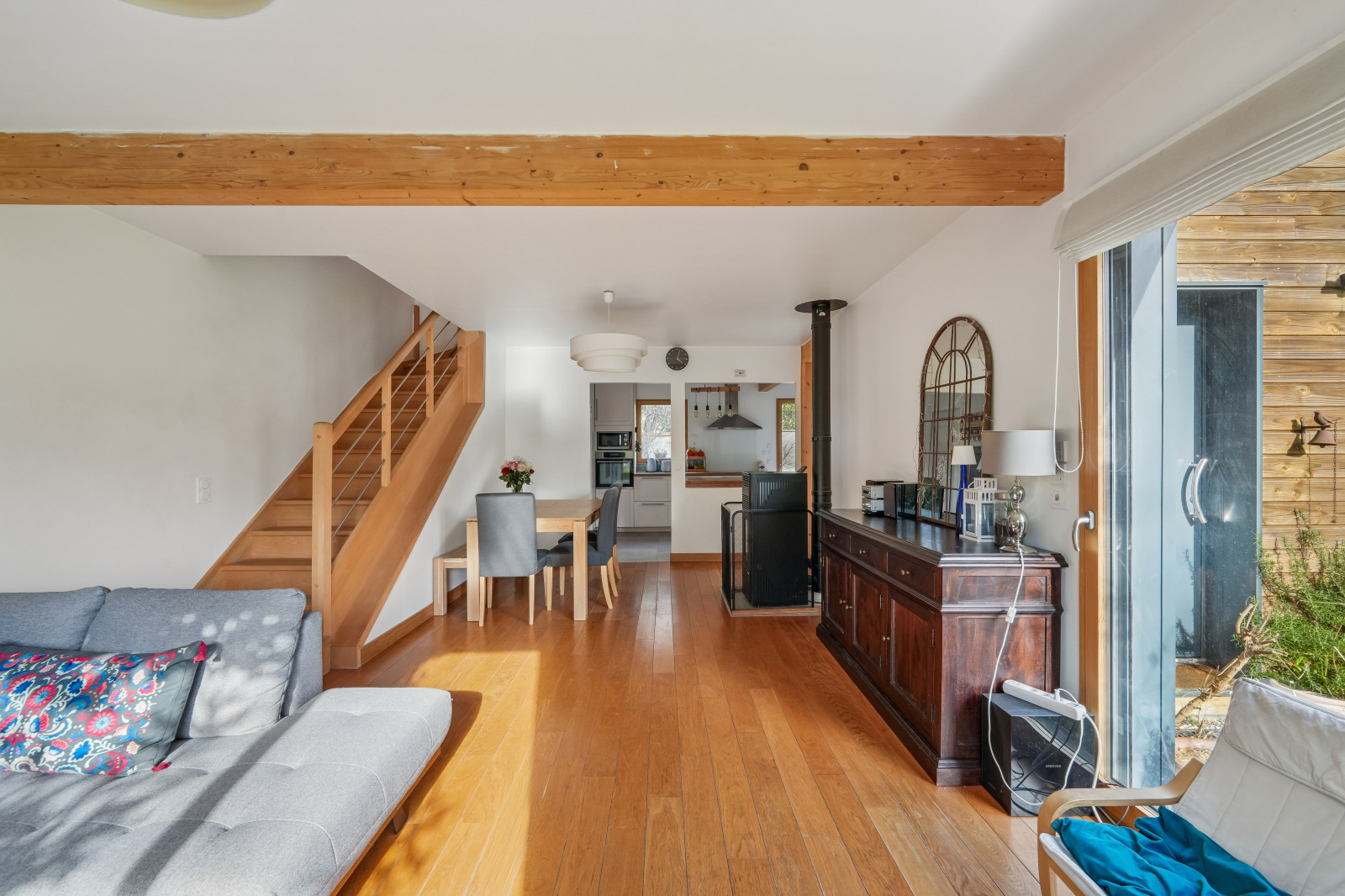 Le séjour et la cuisine s’ouvrent directement sur l’extérieur, invitant à profiter pleinement du jardin.