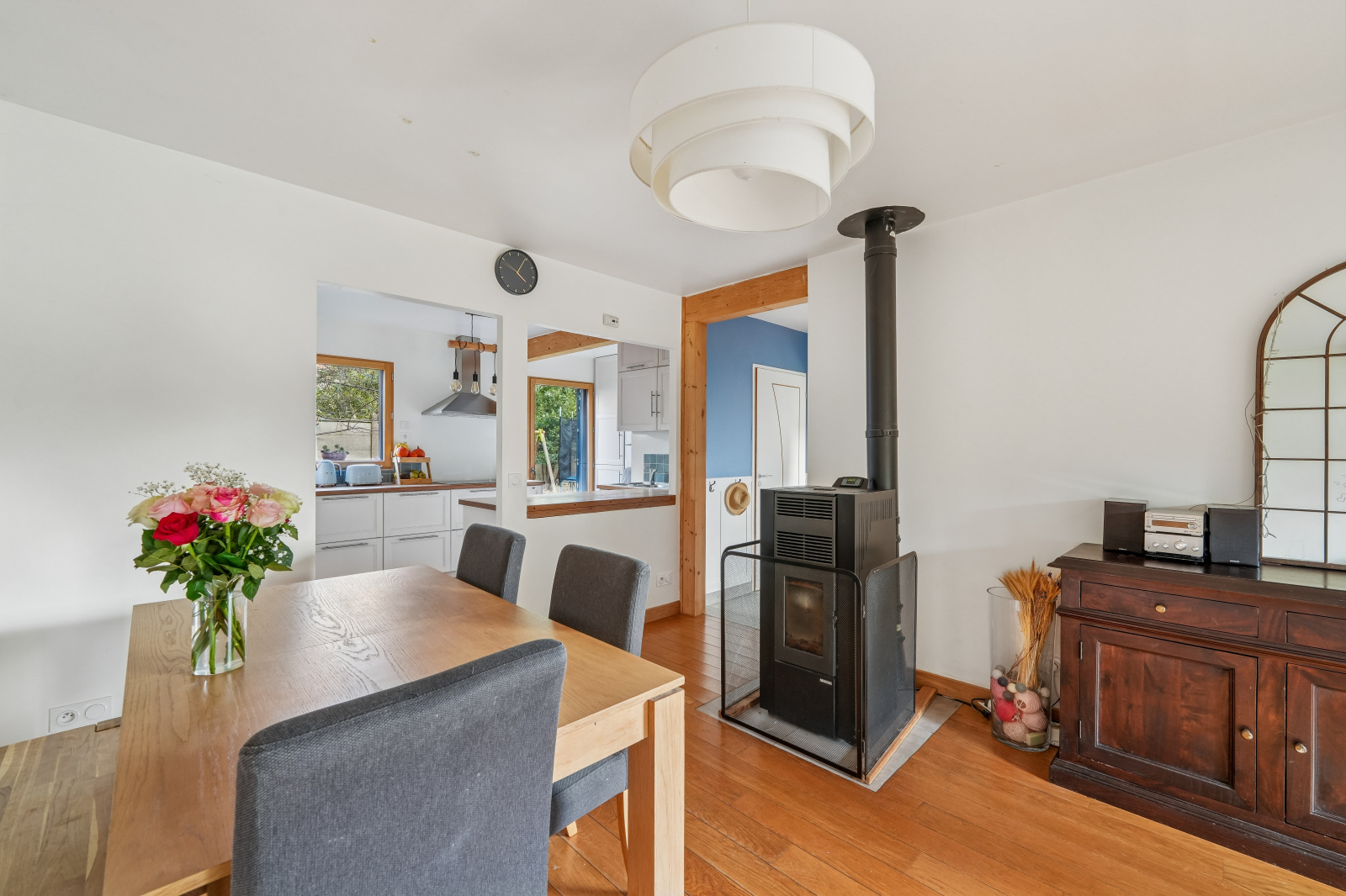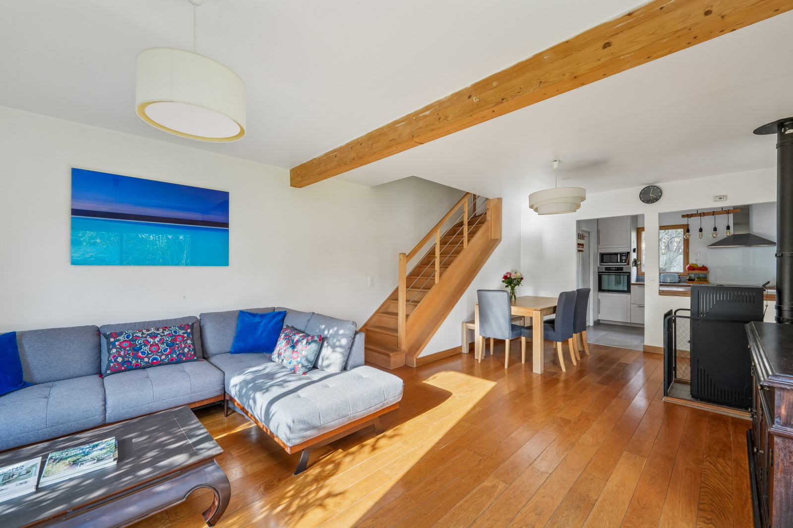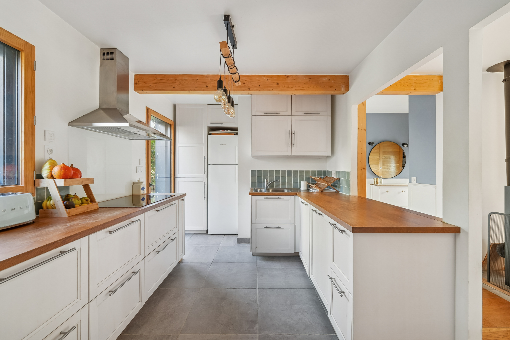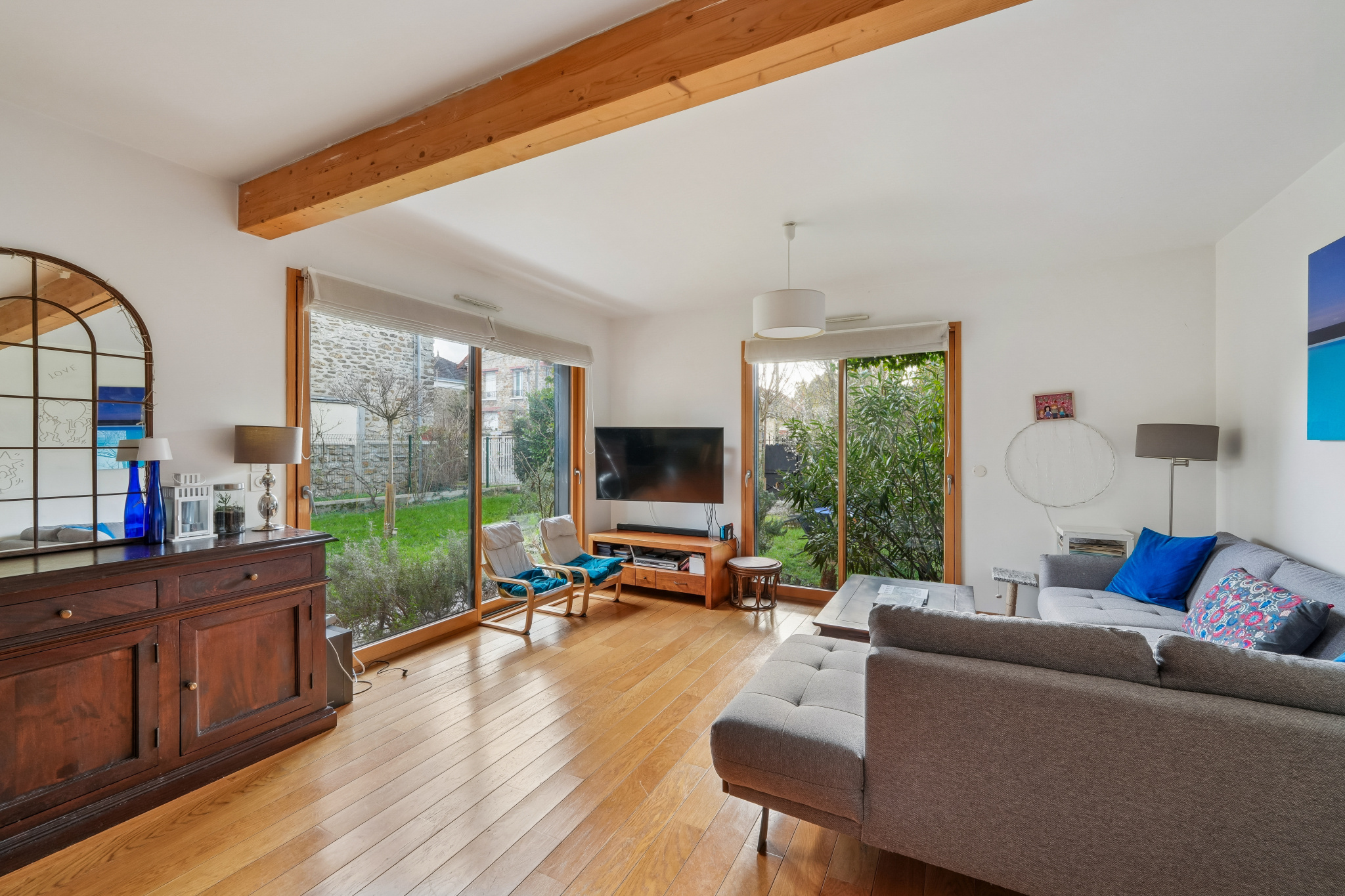 Le séjour et la cuisine s’ouvrent directement sur l’extérieur, invitant à profiter pleinement du jardin.
