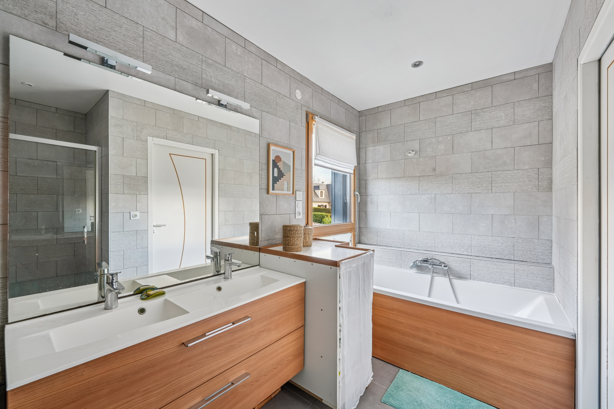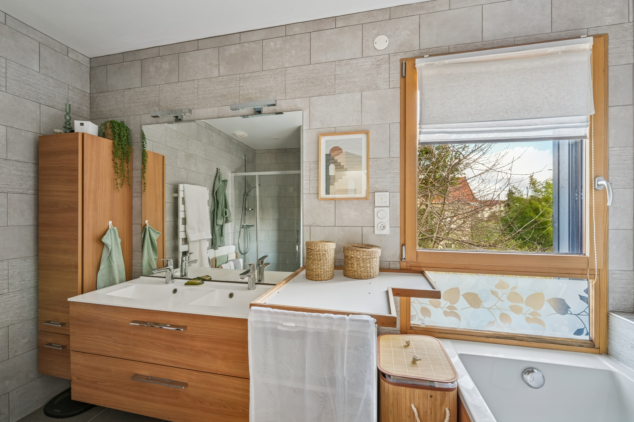 Le rez-de-chaussée accueille également une chambre avec salle d’eau privative, équipée d’une douche à l’italienne et éclairée par une grande fenêtre — idéale pour une suite parentale ou une chambre d’amis. Un WC indépendant complète ce niveau.