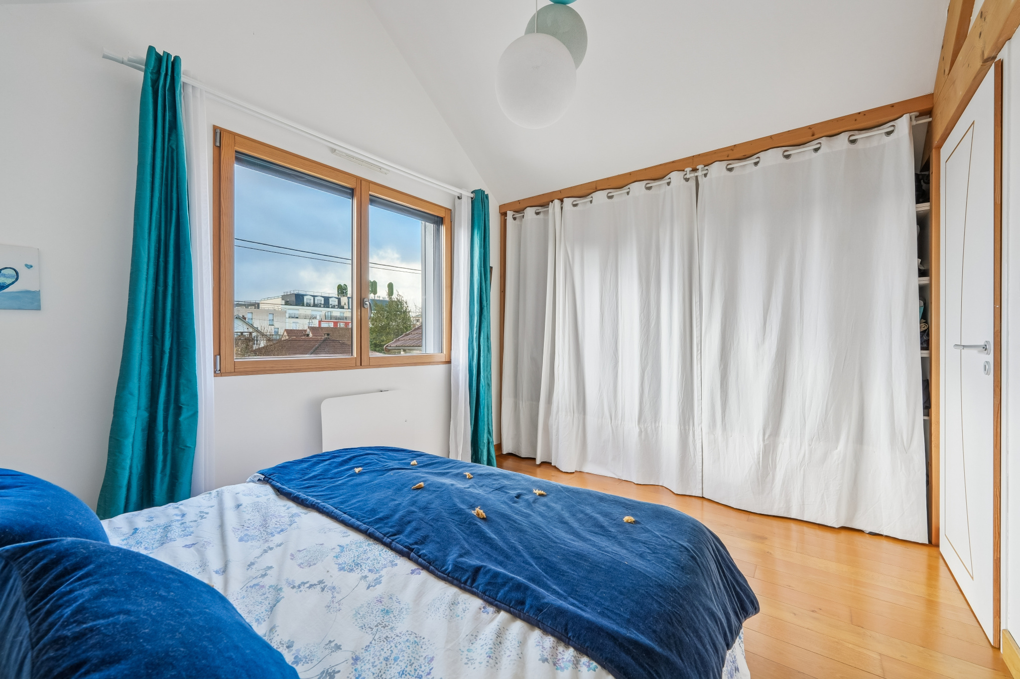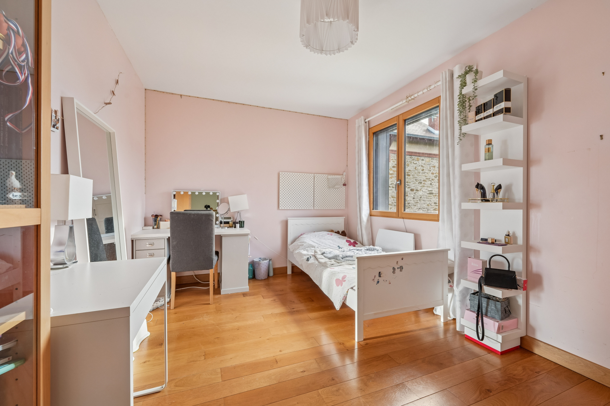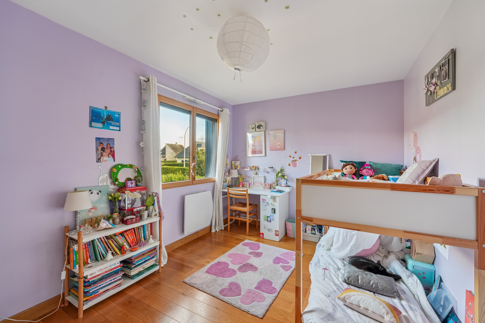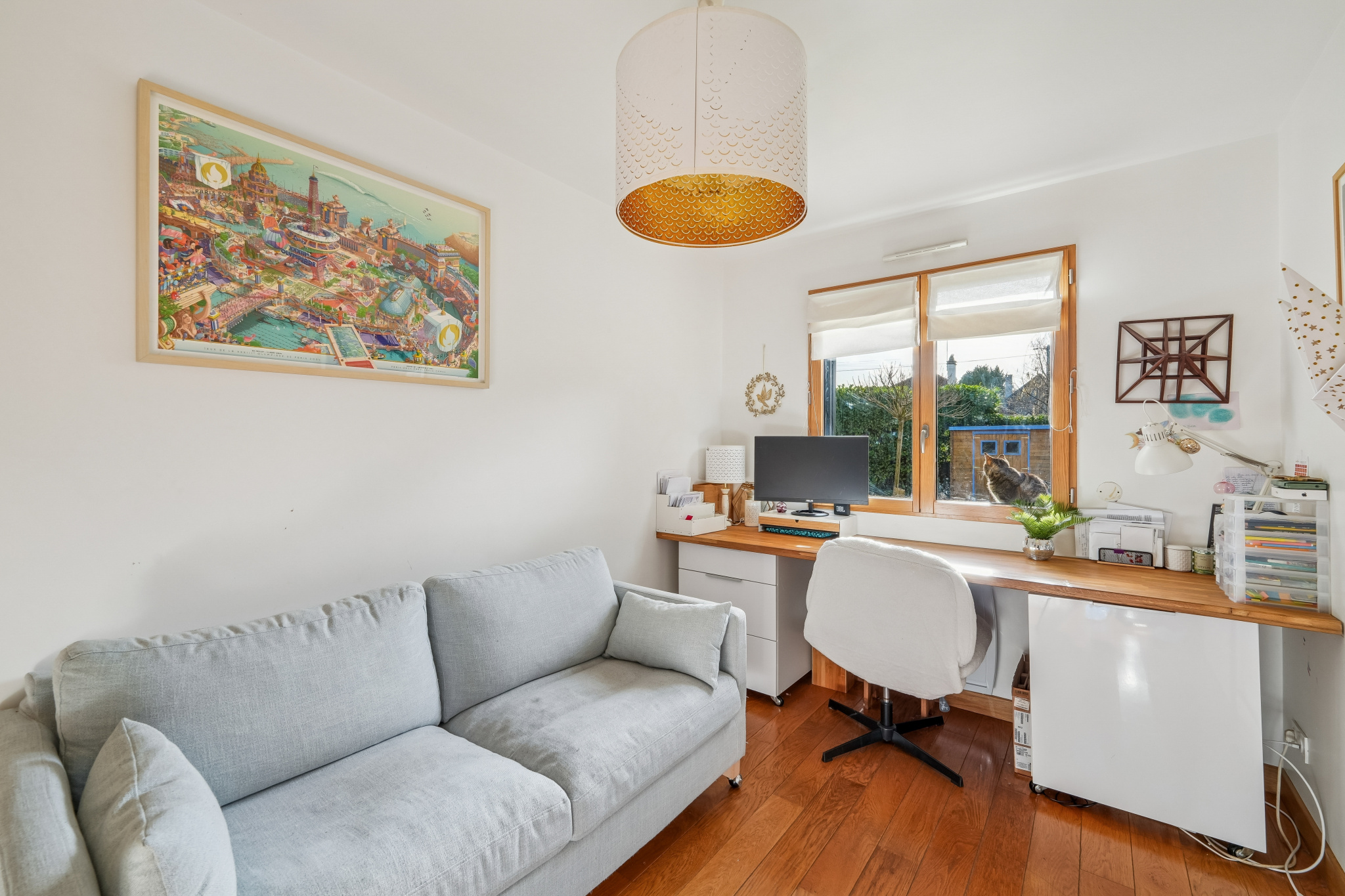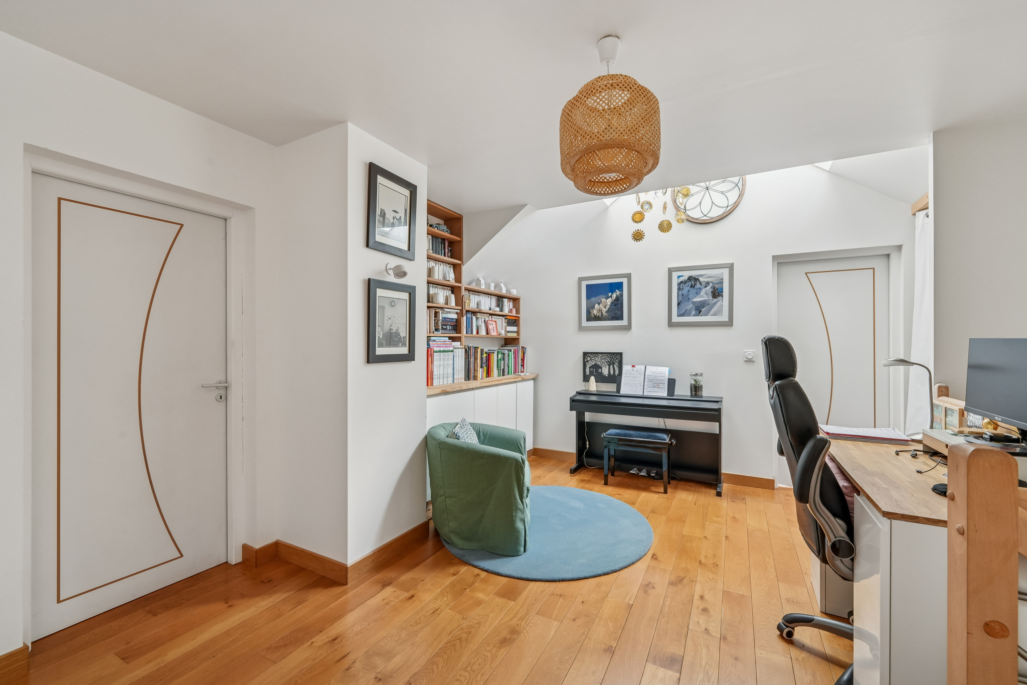 À l’étage, un vaste espace de 17 m², aménagé avec placards et bibliothèque, est parfait pour le télétravail.